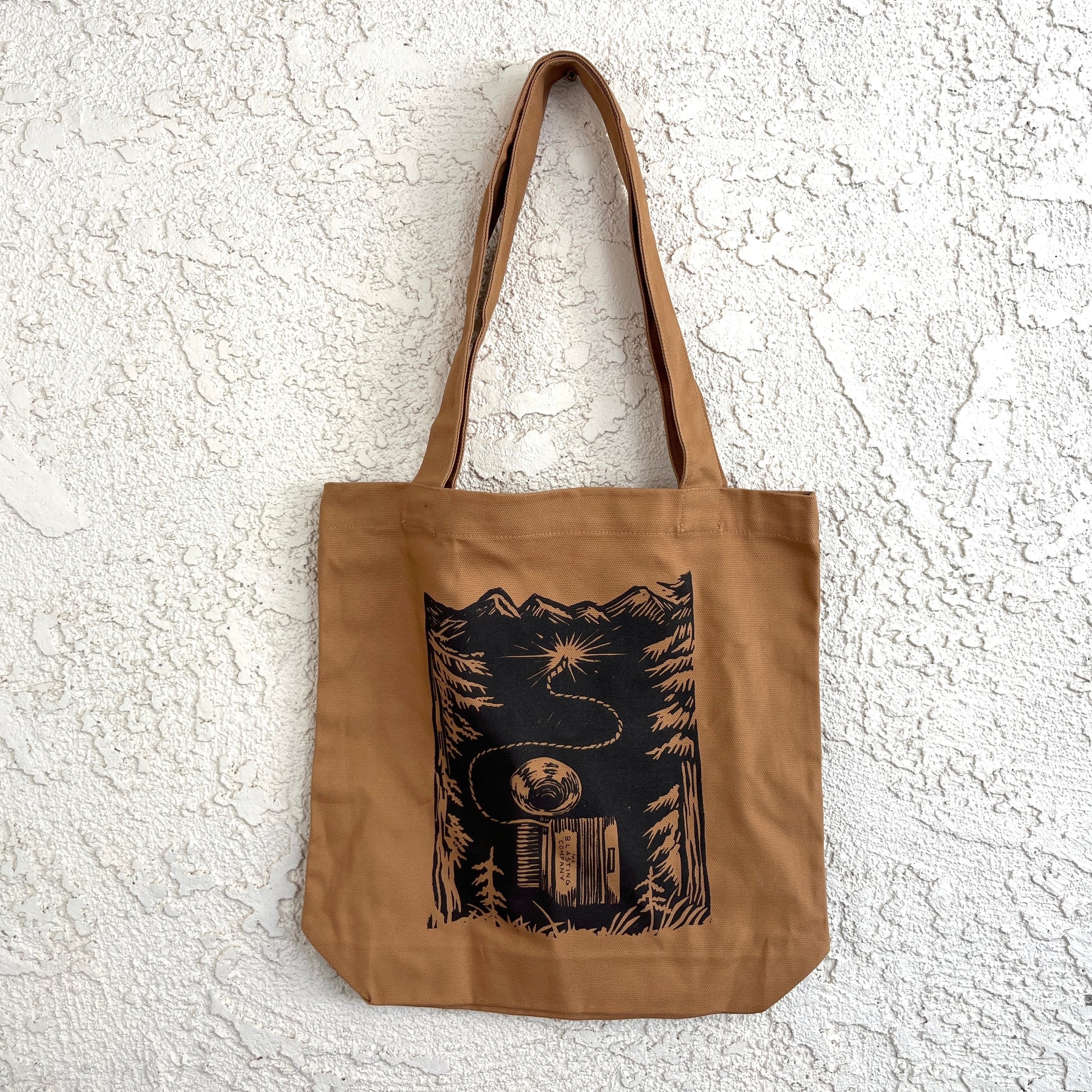 Camel brown canvas tote bag with silkscreened Alpine Forest linocut print.